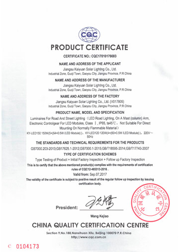 開元太陽能照明于2009年通過了ISO9001產(chǎn)品質(zhì)量體系認證、環(huán)境管理體系14001認證、職業(yè)健康與安全管理體系18001認證,太陽能路 燈CQC認證、金太陽認證、CE證書、RoHS認證、TUV認證及世界多個國家認可的鋰電池、太陽能路燈整套系統(tǒng)的CB認證證書,多項產(chǎn)品通過了:lEC60598-2017、IEC61215:2016、IEC62619:2017、IEC61427等檢測,公司產(chǎn)品同時獲得了多項第三方機構(gòu)的檢測報告,成為了“國際研究機構(gòu)推薦的太陽能路燈市場主要參與者”。